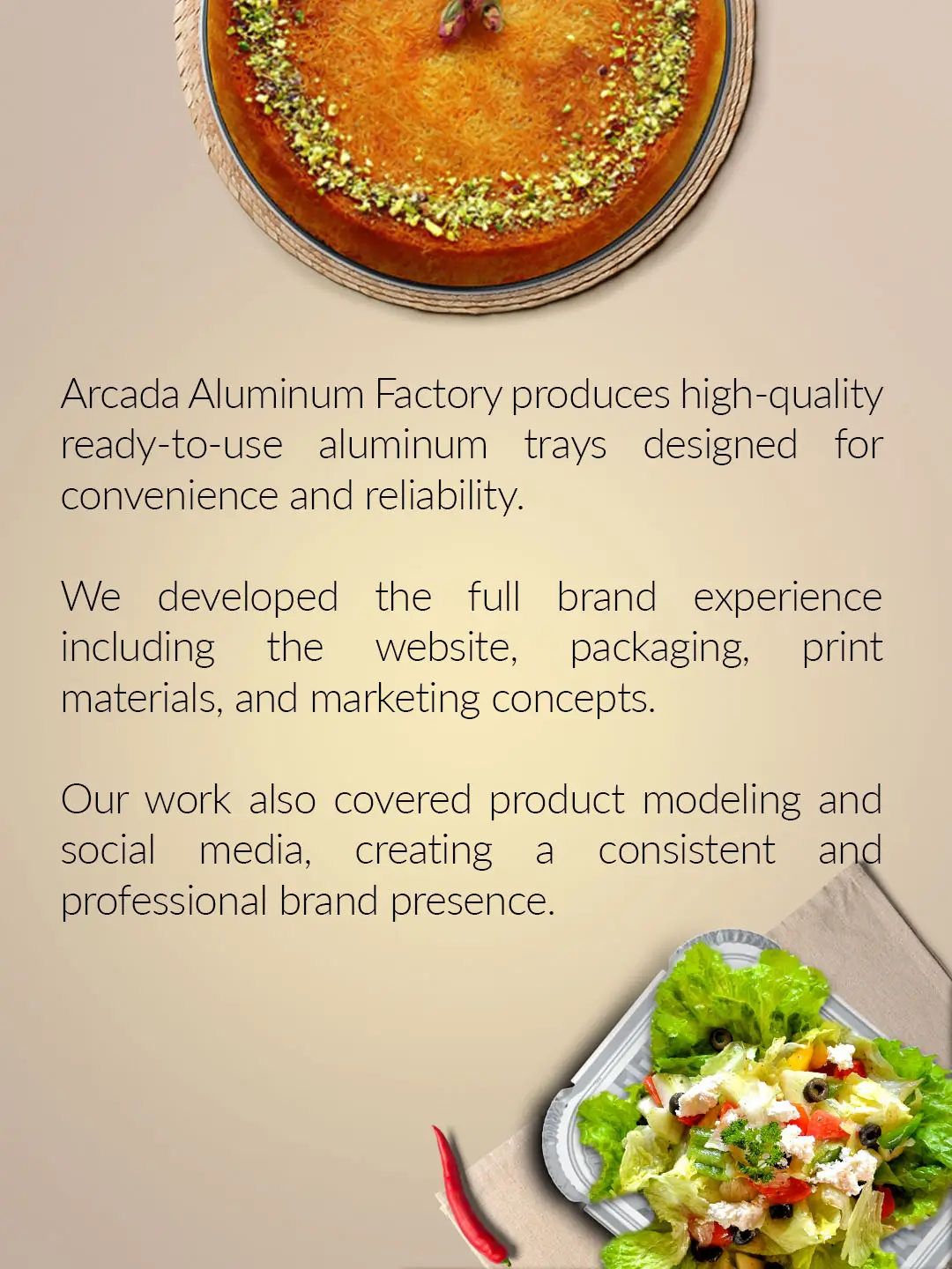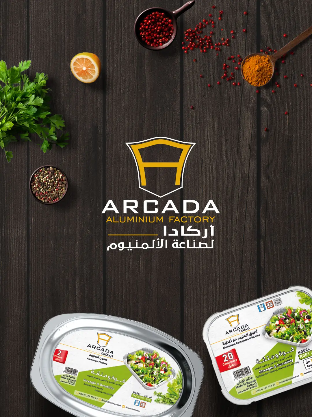 Arcada Aluminum Arcada Aluminum Factory produces high-quality ready-to-use aluminum trays designed for convenience and reliability. Client : Arcada Aluminum Category: Packaging, Printing, Social Media, Web Designs Location : Kuwait Year : 2024